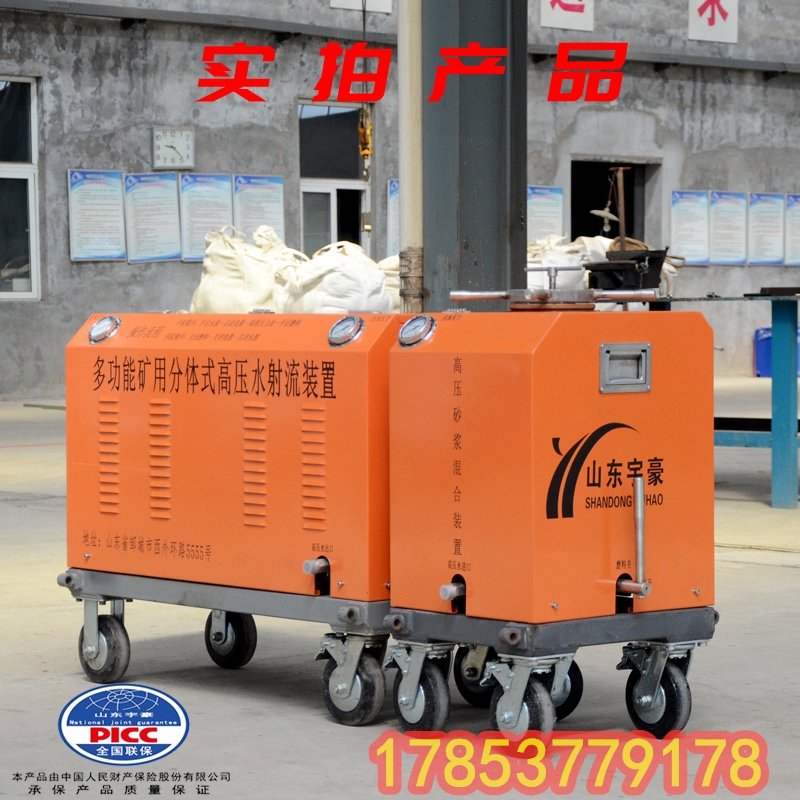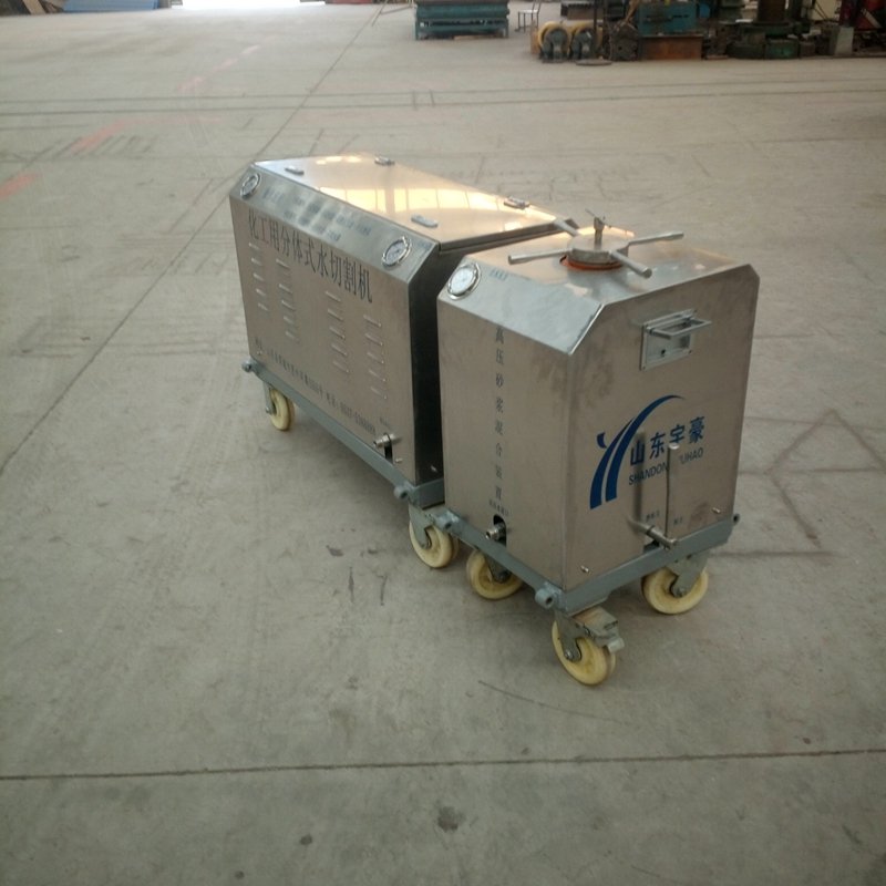 工作介质通过低压软管经储水罐过滤后流入高压柱塞泵,电动机为高压泵提供动力,将工作介质加压,高压水流经高压软管进入高压砂浆混合装置,与磨料充分混合,并带动磨料加速,通过Φ1.02mm的割嘴,形成高压砂浆射流,进行切割作业。