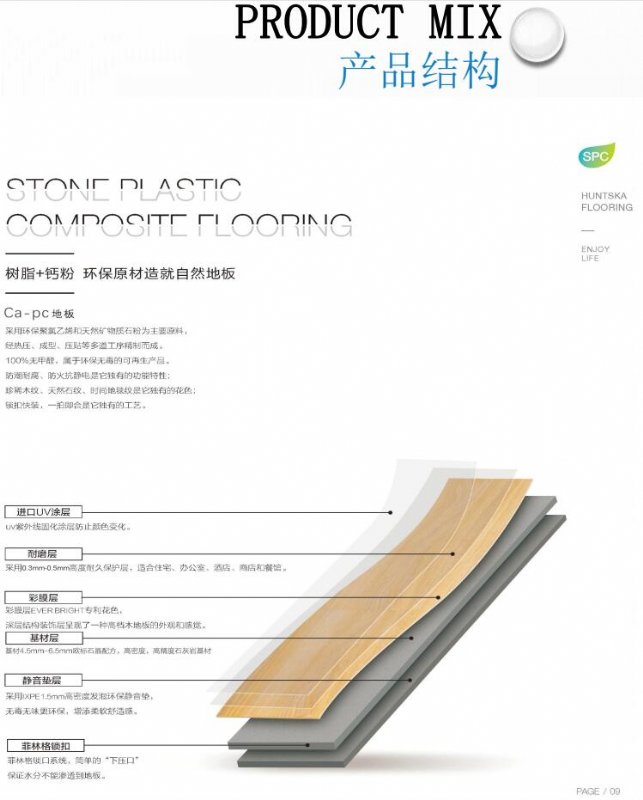 SPC 地板主要由钙粉、聚氯乙烯树脂,稳定剂组合的一定比例挤塑而成的地铺材料。是响应国家减排而发明的新型..