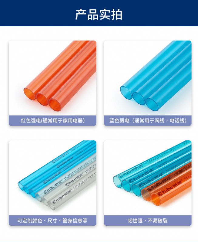 1)真材实料:透明线管,采用纯PVC原料,不添加钙粉,相对普通线管来说韧性更强,可承受高强度的冲压性能,耐用性更高,使用寿命更长;