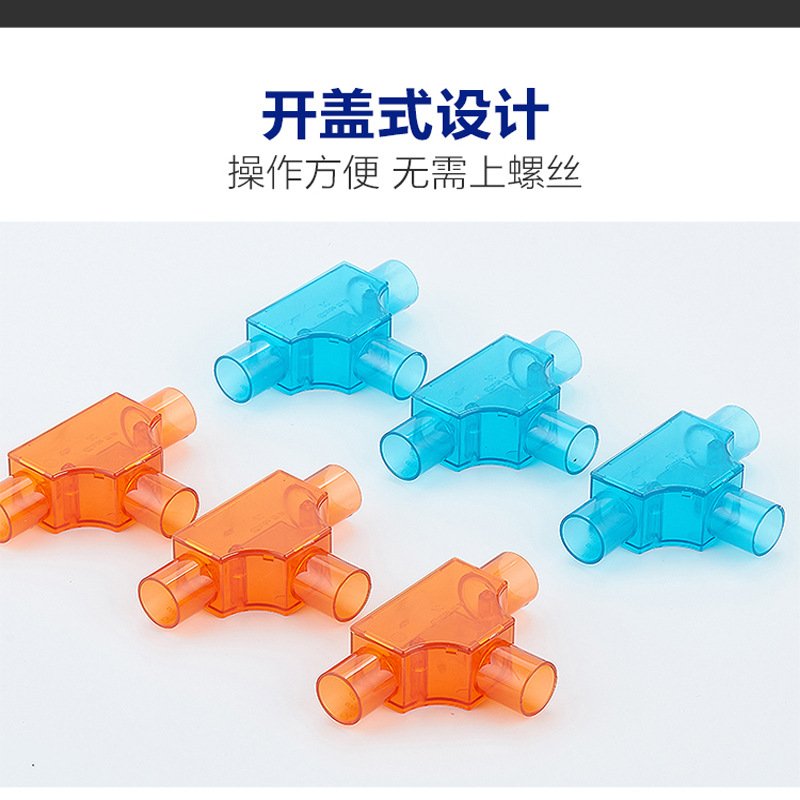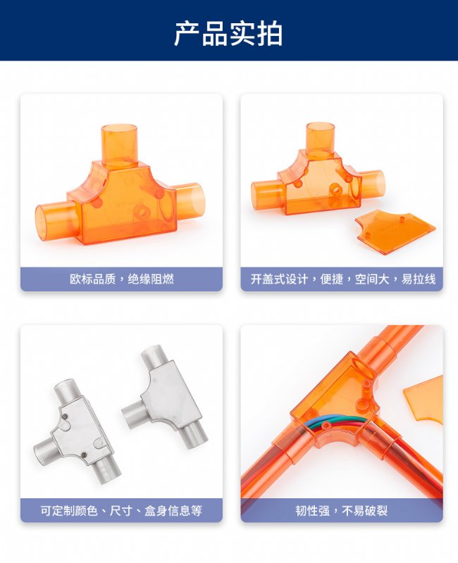 应用于“全屋活线 无需人弯管”施工工艺,三通接线使用,自扣式开盖设计,内部采用圆柱支点结构,避免电线磨损,无死角,拉动容易,管内电线畅通无阻。
