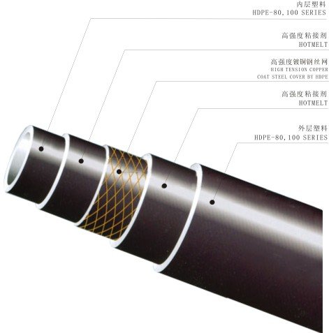 钢丝网骨架管塑料(聚乙烯)复合管是以高强度镀铜钢丝左右螺旋缠绕成型的网状钢骨架为增强体,以高密度聚乙烯(hdpe)为基础,并用高性能的粘接树脂层将钢丝网骨架与内外层高密度聚乙烯紧密连接在一起。该粘接树脂是一种高性能粘接材料,属于hdpe改性材料,与hdpe在加热条件下能完全熔融为一体,同时,其极性键与钢有极强的粘接性能,由于粘接树脂的使用, 成功地解决了钢、hdpe间无连接因子的问题,具有更优良的复合效果。