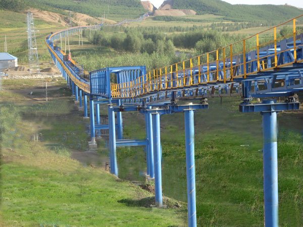长距离曲线带式输送机是指采用平面输送带可以实现平面转弯的特种带式输送机,也可以伴随着平面转弯进行竖向凸凹弧转弯,构成空间转弯。它是通过将输送带的内曲线抬高,使输送机运行时产生一个向外的离心推力来克服由转弯造成的输送带张力的向心合力,保证输送带的转弯运行。 采用弯曲的运行线路以绕开障碍物或不利地段,实现少设或不设中间转运站,从而达到减少设备数量之目的,使系统的供电和控制系统更为集中方便,提高系统安全运营的可靠性.