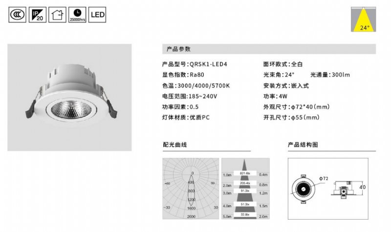 外径尺寸:Ф65mm 开孔尺寸:Ф55mm 光束角度:30° 材质:高纯度铝材 功率:5W 美国科锐进口..