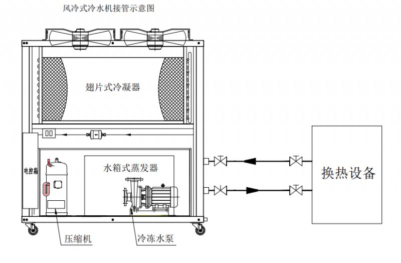 风冷式冷水机机身内含有保温水箱和水泵,散热方式是通过风扇来驱散的.需保持厂房内空气流畅,这样能增强制冷功..