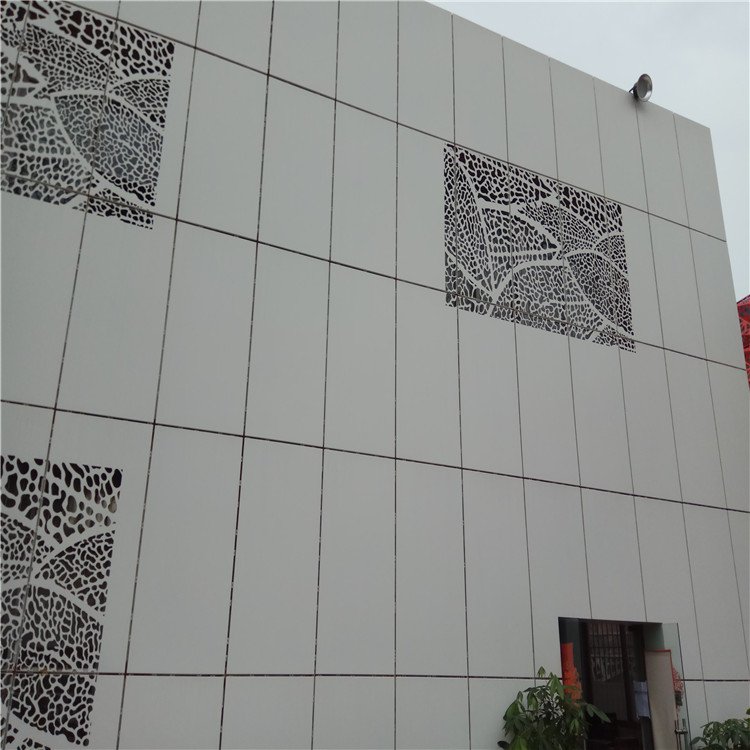 铝合金幕墙板介绍: 镂空雕刻铝板是铝单板产品一员 2、 铝板经过、现场测量尺寸、设计、画图、工厂开料、切割、冲角、板面镂空雕刻出各种图案。 3、加工程序,把参数输入数控机床,把整体参数输入数控机床雕刻机,数控机床会自动镂空雕刻出,我们所需要的精确的镂空雕刻铝单板幕墙装饰材料 4、 可以把整体幕墙分割成600mm*1200mm在进行拼装整体效果图案 5、 每件镂空雕刻铝单板也是一小块整体,体现幕墙装饰镂空雕刻铝单板真加了艺术造型元素镂空雕刻铝单板喷涂: