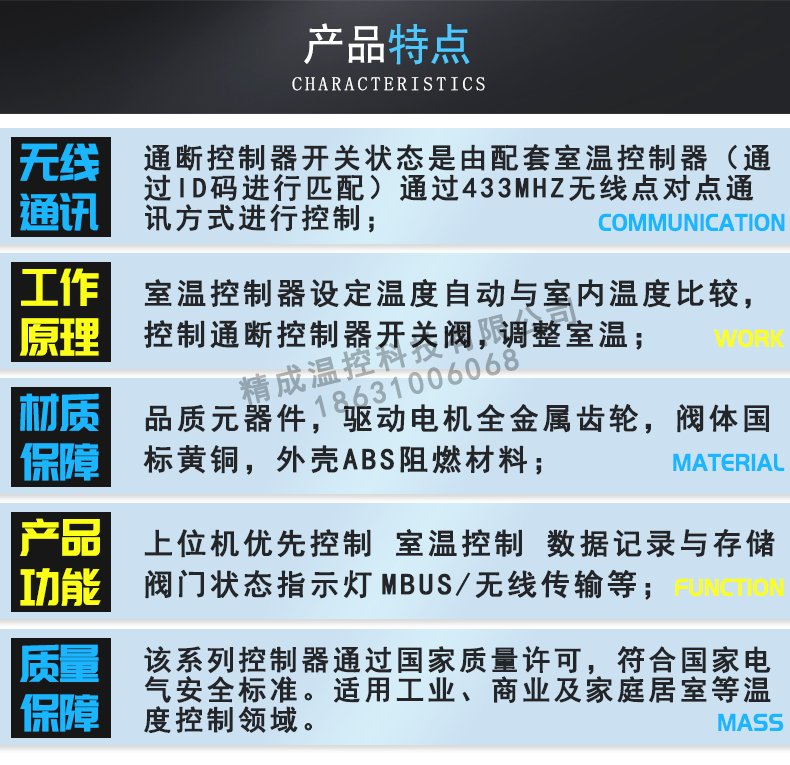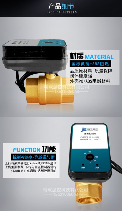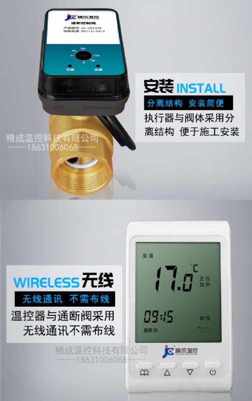 电动通断控制器是由精成温控科技有限公司开发生产的户用多功能阀门,主要用于供暖系统,具有远程锁控、温度控制等功能。由上位机控制的多种工作模式集一身,有效降低热能损耗,多种工作模式配合使供暖更人性化智能化,更加节能。实现了供热公司按面积收费情况下用户先付费后用热的目的,信息传输采用加密传输,有效防止技术开启,有效减少了欠费问题,提高供热管理部门的管理水平和工作效率。