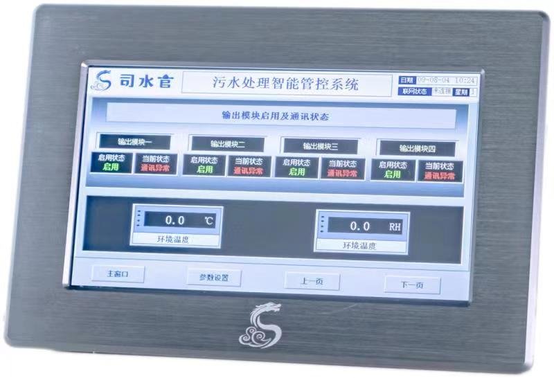 我公司自行研发的“微电脑自控一体机”,主机自身为一台功能强大的自动运行控制器,在没有联网的的情况下,可以通过人机交互界面进行参数调整,手自动模式切换,运行方案调用及修改、紧急开停机、故障诊断报警等一系列的现场控制操作。主机内置有无线联网模块,可以在插入物联卡(或者连入WIFI)后实现与云端服务器的通讯。主机具有常用的污水处理系统控制输入端口,可接入4路浮球、2路液位、5路485仪表共11个输入控制仪器仪表,并可以通过扩展模块随时扩充。