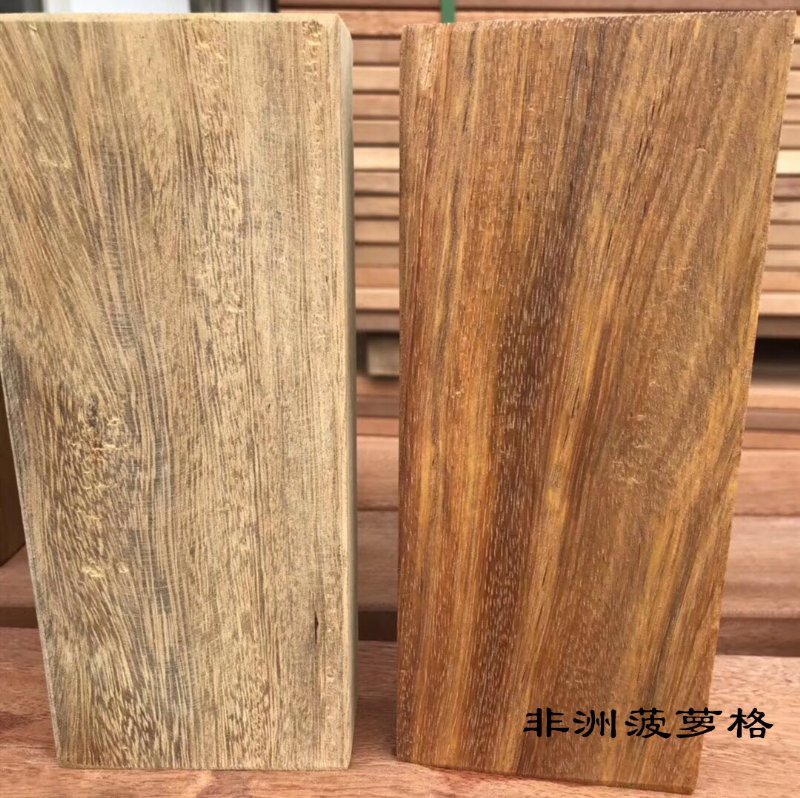 非洲菠萝格现锯材料颜色呈浅黄或青黄,氧化后颜色会渐渐变红,新鲜的板材颜色越青氧化变红的速度越快;