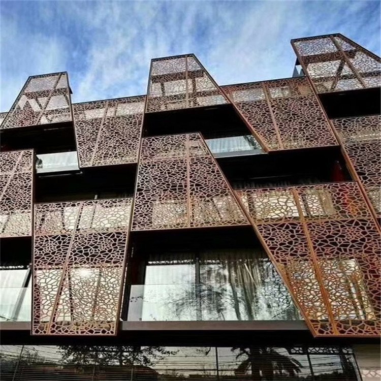 木色镂空铝板,板面可以冲孔、雕花、刻字、镂空、弧形面、造型面等,不同工艺板面都可以装饰出不同风格的款式,重量轻 防火 防潮 不生锈 安全耐用又环保,有较强的立体感,在墙面形成统一美观效果,并且可以和玻璃幕墙等组合成不同的外观形体,使建筑物更具高贵典雅的风格。