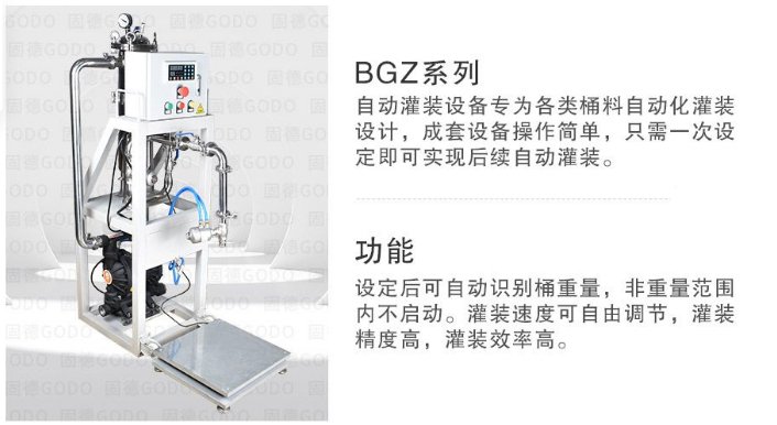 固德牌自动灌装机是专为各类桶料自动化灌装设计,成套设备操作简单,只需一次设定即可实现后续自动灌装。设定后可自动识别桶重量,非重量范围内不启动。灌装速度可自由调节,灌装精度高,灌装效率高。