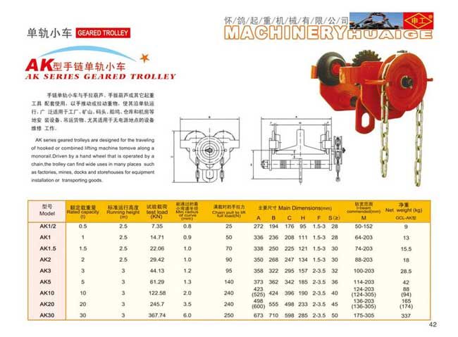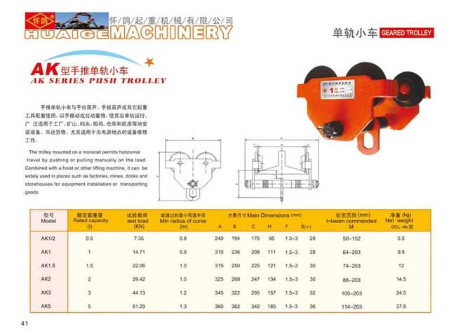 型手链单轨小车与手拉葫芦,手摇葫芦或其他起重工具配套使用,以手推动或拉动重物,