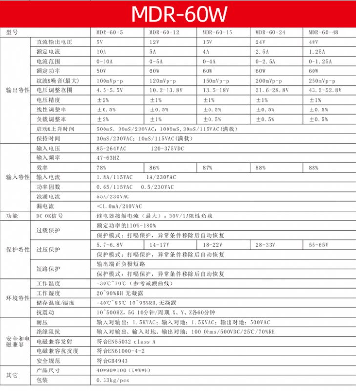全一导轨式电源有:MDR-10/MDR-20/MDR-40/MDR-60/EDR-75/EDR-120/EDR-150/EDR-240/NDR-75/NDR-120/NDR-150/NDR-240【100-240宽范围电压可自动切换】DR-15/DR-30/DR-45/DR-60/DR-75/DR-120/DR-240