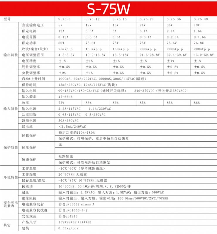 S单组系列:产品特性全球通用全范围交流输入电压,抗干扰性能好,可靠性能高,直流纹波小,工作效率高,工作温度低,使用寿命长,小尺寸、高功率密度,绝缘性能好,抗电强度高,满负荷高温烧机,100%老化测试,有短路保护,过载保护,过电压保护功能。