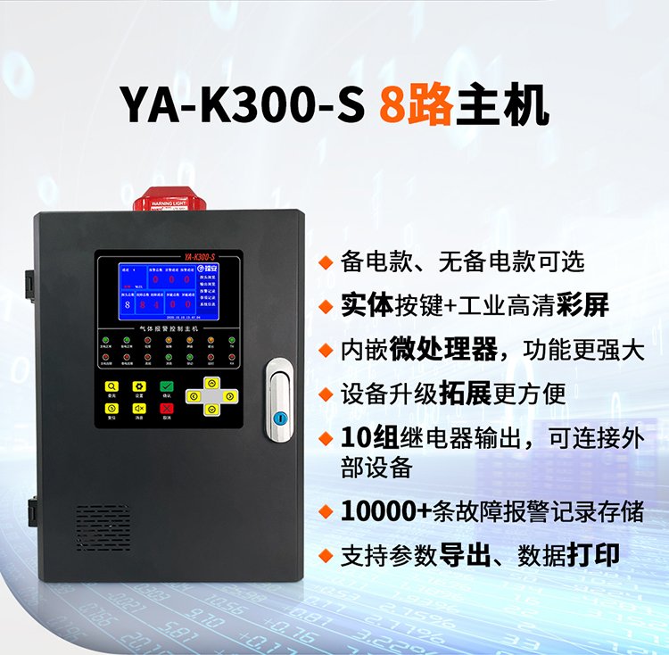 YA-K300 系列气体报警控制器可与本公司的 YA-D 系列气体探测器组成工业气体控制系统。该产品是针对工业环境设计的气体探测预警系统。4.3 寸工业液晶屏显示方式,清晰醒目的实现待测气体的浓度显示,浓度超标后发出声光报警;该产品还设置了多个输出继电器,能以有源和无源方式驱动排风扇、电磁阀等设备,适应不同的现场情况;其设计遵循国家标准, 具有响应速度快,高可靠性,低故障率,易于维护等优点。尤其是在报警故障的判断上,使用了多次事件延时确认的方法,有效的防止了误报,为人们的生命财产安全提供了有力保障。