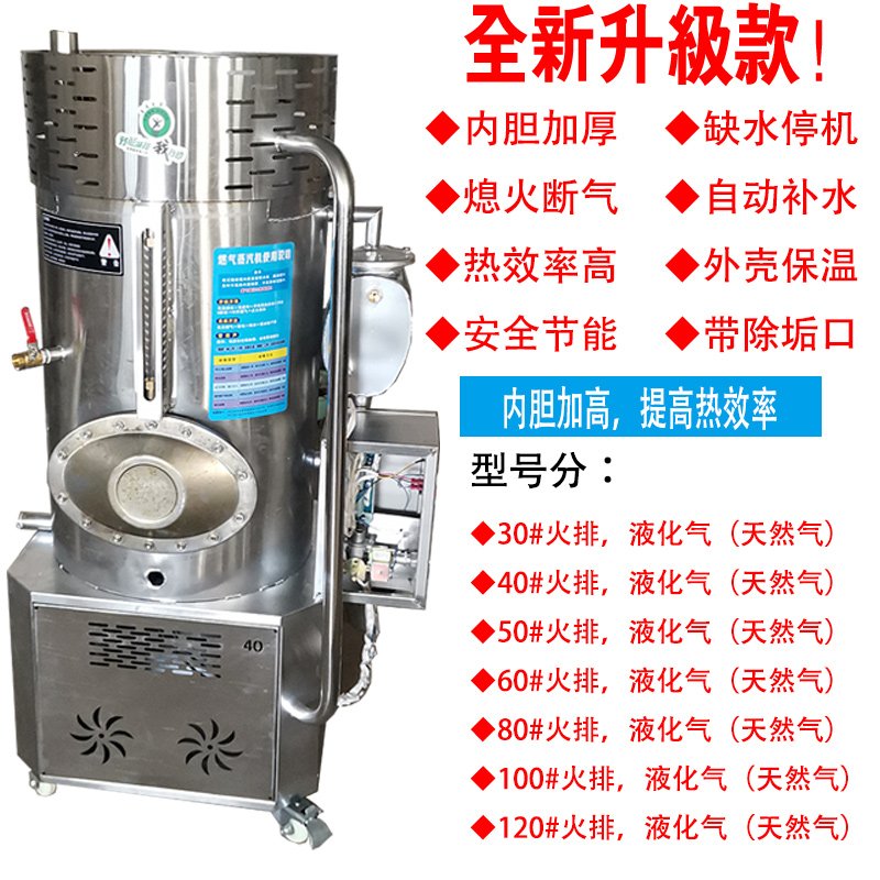 本系列节能蒸汽机是一款即热即用设备,以加热快、蒸汽量大、热效高而深受用户欢迎,它是我公司专业技术人员精心研发的高效、节能、环保产品。本产品采用全不锈钢制造,脉冲点火、款式大方得体、维护方便、自动供水、带除垢设计、防干烧,具有操作简单、燃烧性能好、热效率高、产汽速度快,使用噪音小、废汽排放少等优点。它除广泛应用于厨房(海鲜蒸柜、蒸凉皮、蒸米酒、蒸包子、蒸馒头、蒸米粉、蒸河粉、蒸肠粉、蒸饭柜、肠粉炉、碗筷、消毒柜等)蒸汽设备外,还可以用于桑拿、浴室、医药、纺织、服装、工业、食品制造等需要蒸汽的行业。与传统产品相比,热效率更高、更环保、更节能、更安全。