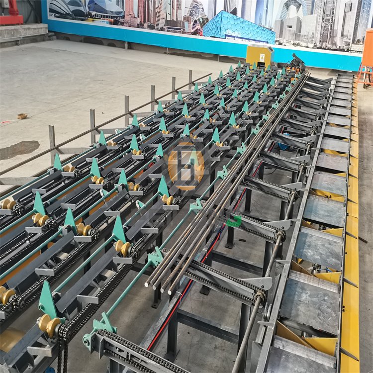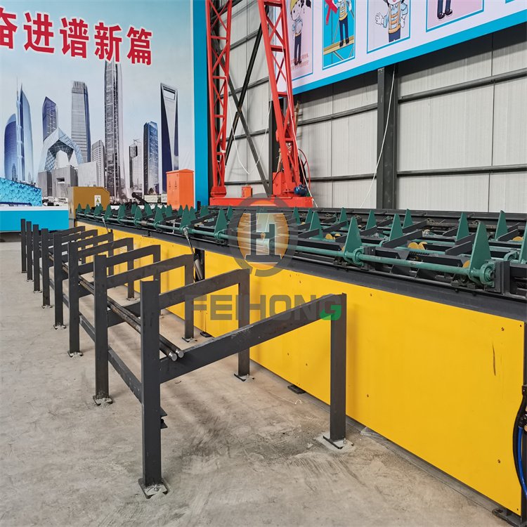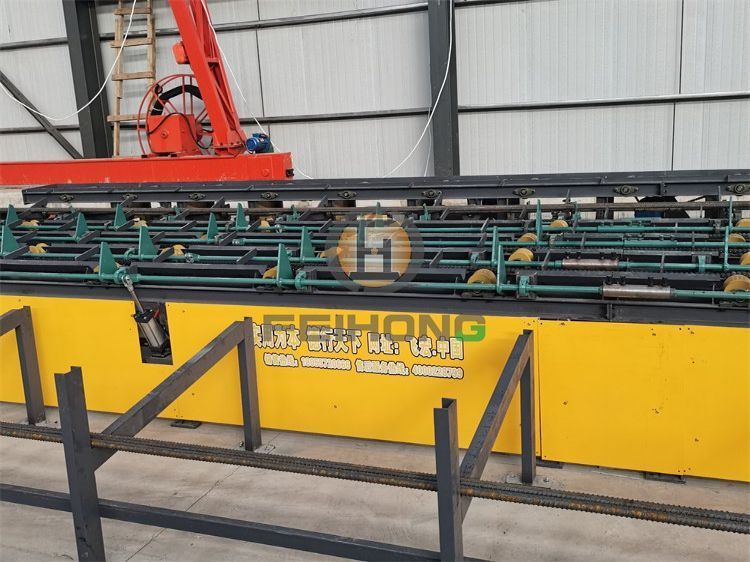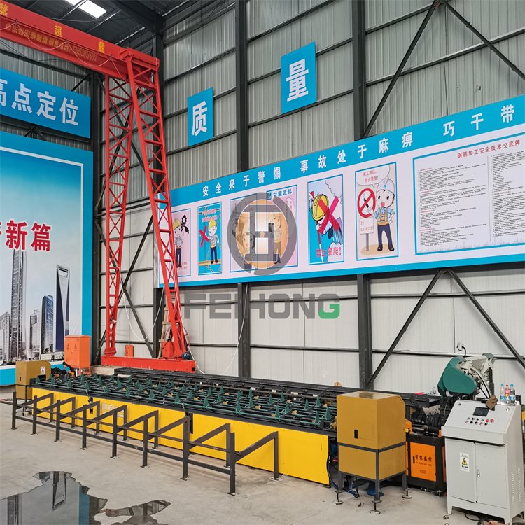 FHST-40SAC型数控钢筋锯切套丝打磨生产线主要由备料架、锯前输送轨道、锯切主机、锯后输送卸料轨道、送料平台、一号套丝辊道、一号套丝机、二号套丝机、二号套丝辊道、一号打磨机、一号打磨辊道、二号打磨辊道、二号打磨机、储料平台、电控柜、操作柜十四部分组成。设备采用数字化控制,响应速度快,具有结构简单、易操作、效率高、功能强、维护方便的特点;
