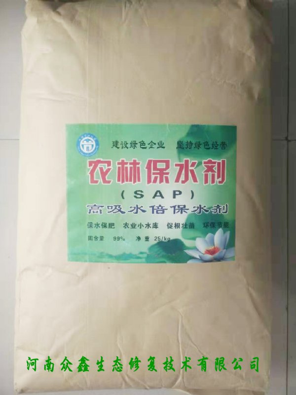 农林保水剂是一种高吸水性树脂,能吸水膨胀。它遇水时,在几分钟内可吸收比自身重量大几百倍甚至上千倍的水分,将水分约束在体内。缺水时,它又能将所固定的水份缓慢地释放出来,维持周围的水分平衡。并且这种吸水释水性可反复多次。具有增加药效、肥效,保水性好,有效期长等特点,是减少蒸发,节约灌溉用水,增加效益的一项重要措施。