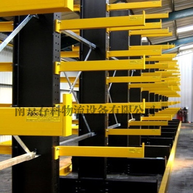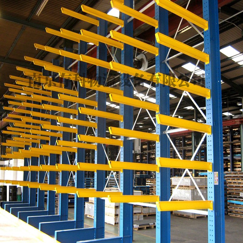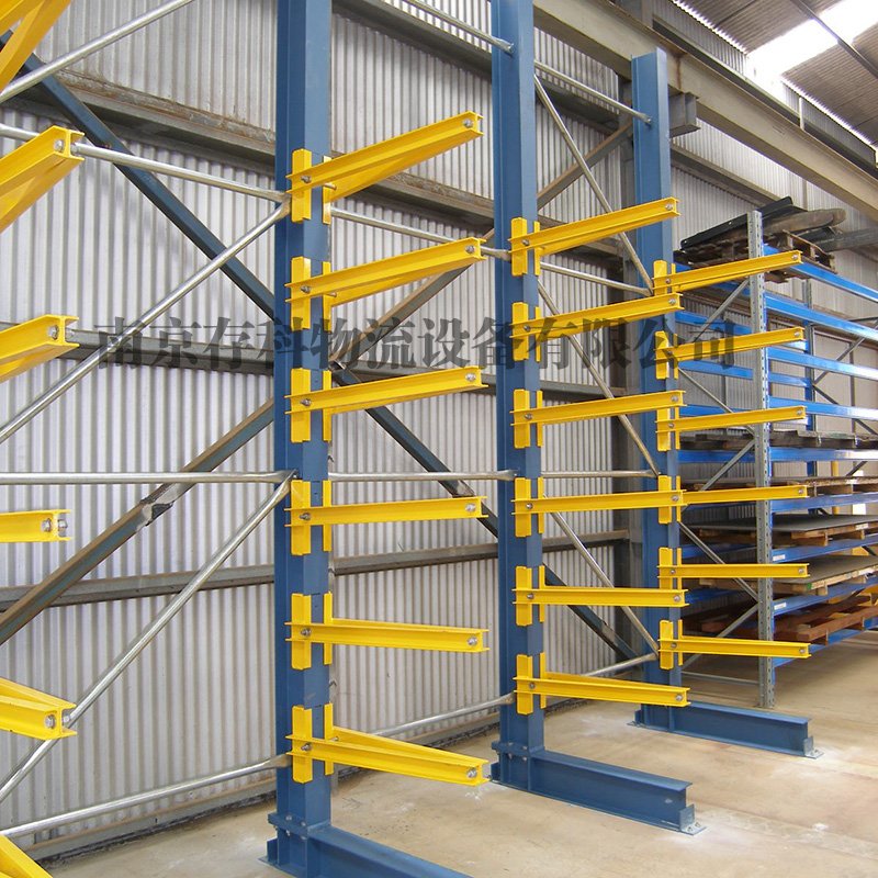 悬臂式货架适用于存放长物料、环型物料、板材、管材及不规则货物。悬臂式货架立柱多采用H型钢或冷轧型钢,悬臂采用方管、冷轧型钢或H型钢,悬臂与立柱间采用插接式或螺栓连接式,底座与立柱间采用螺栓连接式,底座采用冷轧型钢或H型钢。货物存取由叉车、行车或人工进行。