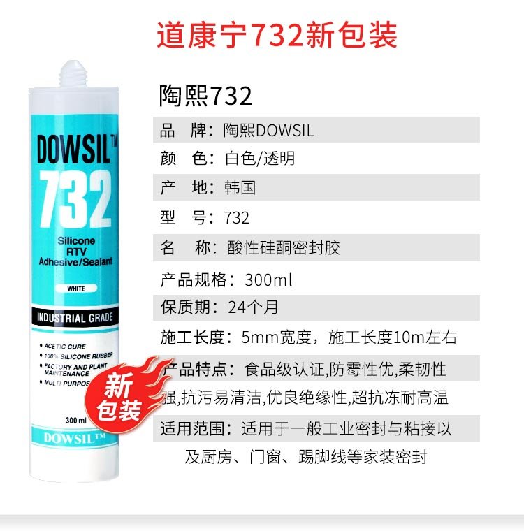 道康宁732特性和优点 : 单组分粘接剂/密封胶 当暴露在空气中水分时,在室温下就可以固化 脱酸固化体系 不垂流,膏状物