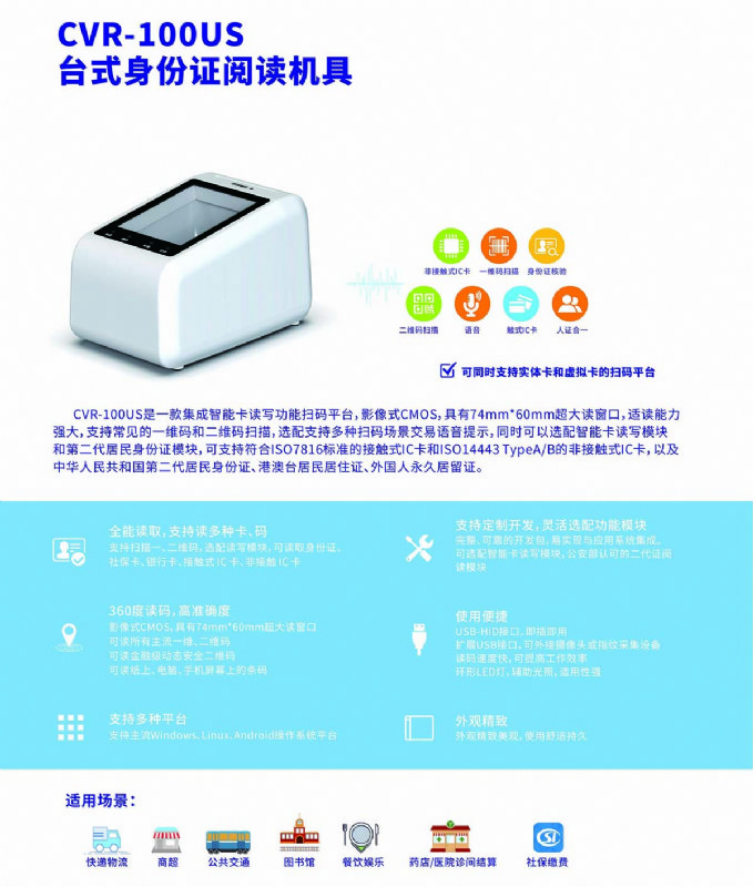 CVR-100US是一款集成智能卡读写功能扫码平台,影像式CMOS,具有74mm*60mm超大读窗口,适读能力强大,支持常见的一维码和二维码扫描,选配支持多种扫码场景交易语音提示,同时可以选配智能卡读写模块和第二代居民身份证模块,可支持符合ISO7816标准的接触式IC卡和ISO14443 TypeA/B的非接触式IC卡,以及中华人民共和国第二代居民身份证、港澳台居民居住证、外国人**居留证。