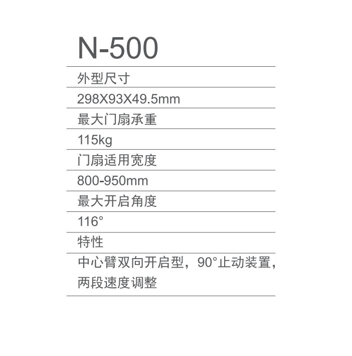 最大门扇承重:90kg 门扇尺寸:900*2100mm 最大开启角度:125度 定位:90度/115度 ..