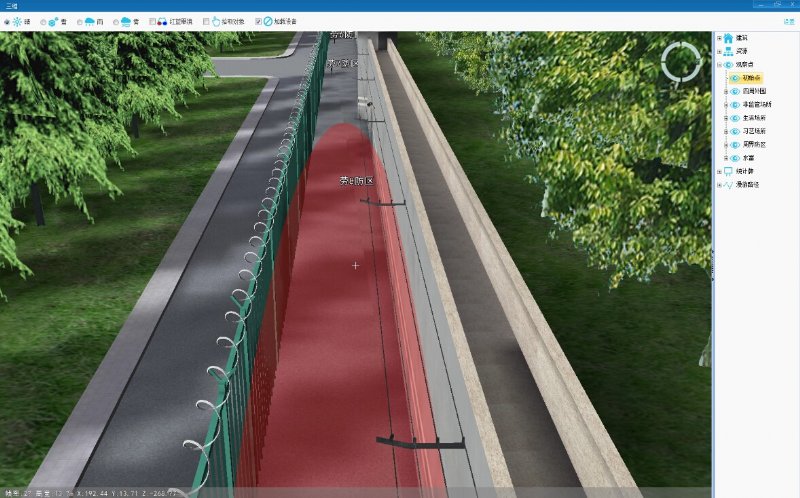 13、将三维平台内的区域、目标进行视景划分,通过点击选择功能按钮即可切换至不周视角的场景。