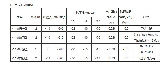 技术特点:早强,高强,大流动度(自流),无收缩,抗油渗 1、早强、高强:一天强度*高可达50MPa以上,设备安装完毕一天后即可运行生产。2、自流态:现场只需加水搅拌后,直接灌入设备基础,不需震捣便可填充设备基 础的全部空隙。3、微膨胀:以保证设备与基础之间紧密接触。 4、无锈蚀作用:对钢筋、钢板等无锈蚀危害。5、抗油渗:在机油中浸泡30天后其强度比浸油前提高10%以上。6、耐 久 性:200万次疲劳实验,50次动融循环实验强度无明显变化。 7、耐候性好-40℃~600℃长期安全使用
