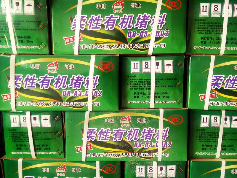 柔性防火堵泥是一种柔性防火阻燃材料,具有良好的阻火、堵烟、耐油、耐水、耐腐蚀性能。该材料主要用于电线、电缆的孔洞封堵,以防止电线、电缆发生火灾而甶孔洞向邻室蔓延,减少火灾损失、避免事故的扩大。具有阻烟、防火、防尘、防小动物的功能。因此,该堵料广泛应用于发电厂、工矿企业、高层建筑、造船电力、邮电、变电所、冶金等系统工程中垂直式水平的电线、电缆贯穿孔洞的封堵。