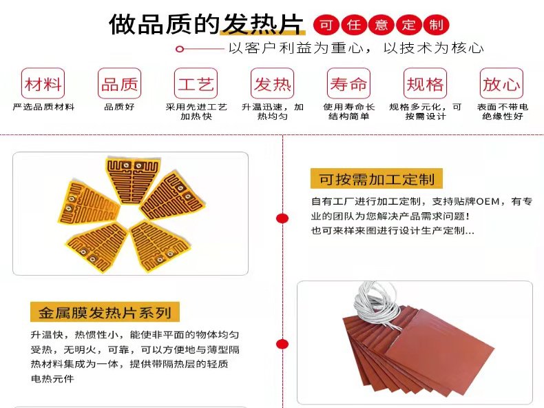 主营业务:PI电热膜、PET电热膜、云母电热膜、硅胶电热膜、金属复合丝发热等。可按要求订做