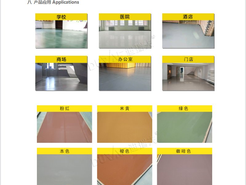 (2)彩色水泥自流平砂浆:浅灰、中灰、深灰、银色、灰白、咖啡色、浅黄、米黄、绿色、红色、粉色、橙色等。