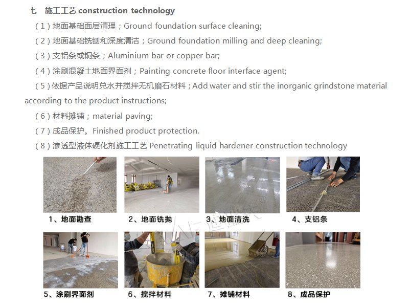 The inorganic grinding stone ecological floor system is made of dry powder cement mortar with special aggregate sand and gravel, which is obtained by adding water, stirring, paving, finding and other professional construction techniques at the construction site. After rapid solidification, it is obtained by grinding, hardening and polishing. An eco-friendly, high-grade gorgeous, durable overall ultra-flat floor system. The system has the properties of fire rating A, color division and shape, hard and dust-free surface, and fast construction. It is widely used in commercial spaces such as exhibition halls, office buildings, hotels, hospitals, schools, stores, clubs, and homestays.