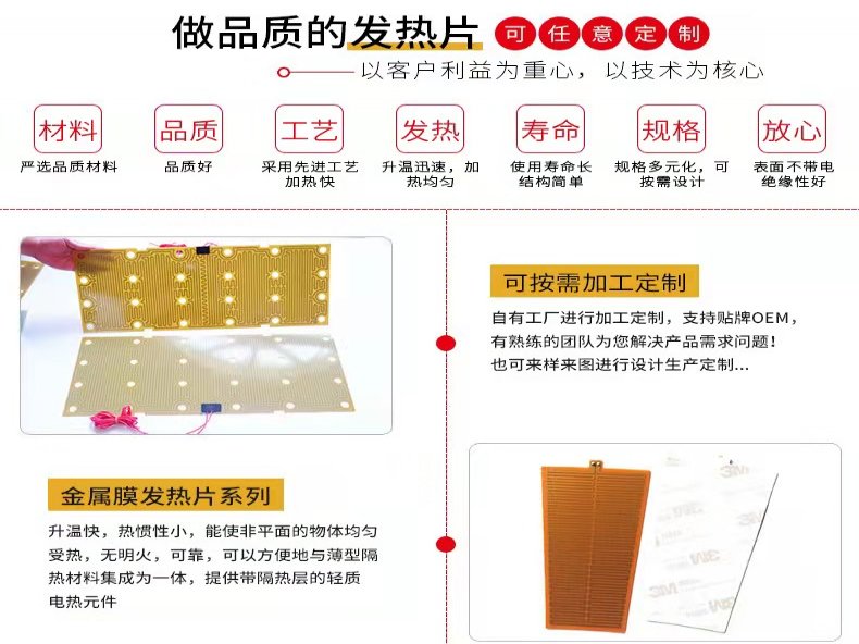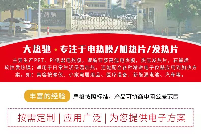 东莞市大热驰科技有限公司是一家专注电热片、薄膜绝缘电热膜的生产制造商,以及其它电子产品开发设计、销售、生产。线上及线下、批发、零售、分销、承接OEM加工等业务的公司。 本公司产品主要有PET、PI低温电热膜,聚酰亚胺高温电热膜,热压发热片,共4大类。各具特性的耐高温高压绝缘基材,我们制作的产品不仅适用于日常生活保温保健,还能配合各种精密电子仪器应用到高端的加热方案,如航空航天仪器恒温仪、。 同时,我们时刻紧跟市场的步伐,努力不懈的研发新产品和新技术,以更的产品满足客户的需求。 因为专注,所以,因为,所以迅速。 公司拥有的生产设备,的技术力量,丰富的设计和生产经验,完备的检测方法,并严格执行质量管理体系,确保每一件产品出厂合格率和运行的可靠性。同时公司具有快捷、完善的售后服务体系,使公司产品在激烈的市场竞争中,赢得广大用户的信赖。