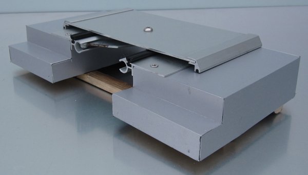2,金属卡锁型:由铝合金基座、铝合金边侧盖板及铝合金中心滑动板组成。中心滑动板夹在边侧盖板与铝合金基座之间,外观整洁、安装方便。适用于50~200mm缝宽。