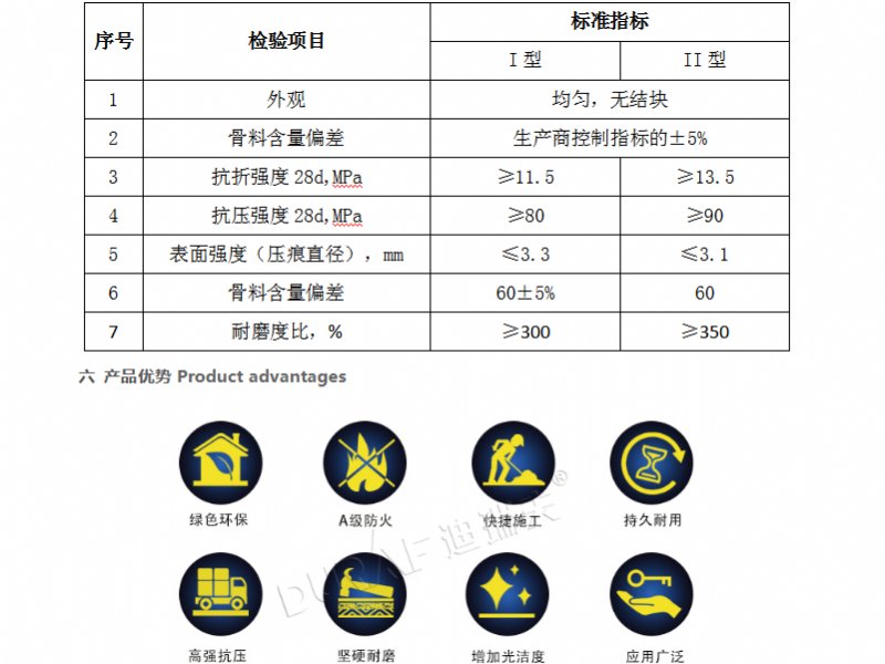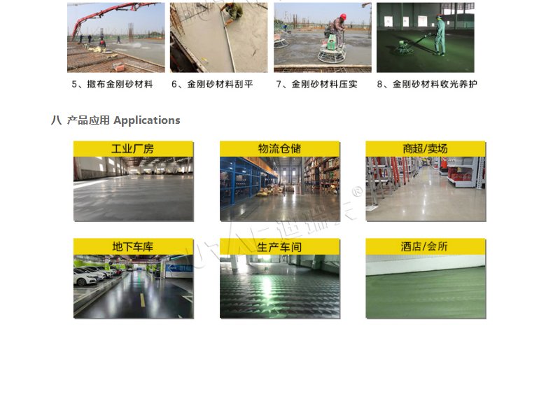 The cement-based wear-resistant material for concrete floor is a dry mortar mixed with high-grade cement, mineral coarse and fine aggregate gradation, and a variety of active admixtures. It is a green building material with high technology content and complex technical links. product. The product can be used after opening the bag, spread it evenly on the concrete surface at the initial setting stage, and process it with special equipment and technology, so as to form a whole with the concrete floor, and obtain a high-performance high-density and coloring property. Wear-resistant floor