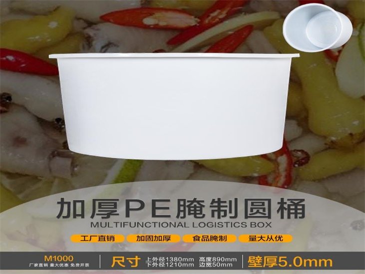 产品常用名称:塑料圆桶、塑胶圆桶、PE圆桶、M桶、食品圆桶、腌制圆桶、竹笋腌制桶、皮蛋腌制桶、泡菜桶、蜜饯腌制桶、落纱桶、饲料桶、漂染桶、养殖桶、发酵桶、调浆桶、棉条桶、圆水桶、孵化桶。用韩国食品级PE原料滚塑一次成型而成 泡菜塑料圆桶产品颜色有白、黑、蓝、绿、黄、红、橘黄、橙色 等,发酵桶主要型号有70L/100L/120L/200L/300L/400L/500L/600L/800L/1m3/1.2m3/1.5m3/2m3/3M3 泡菜塑料圆桶它以优良的卫生综合机械物理性,丰富的内涵力学原理、无焊缝、一次成型、耐酸碱、耐碰撞、耐高温(80℃)、耐冷冻(-30℃)、内外光滑、抗强震、防紫外线照射,符合食品卫生要求。使用寿命长、不长青苔易清洗、移动方便,具有便捷、无需维修等优点。发酵桶,腌制桶广泛应用在食品纺织加工中的存储、周转、清洗。化工行业的酸洗、脱脂。蔬菜加工行业的存发酵、腌制、存藏。食品、化学中的拌料、兑制。