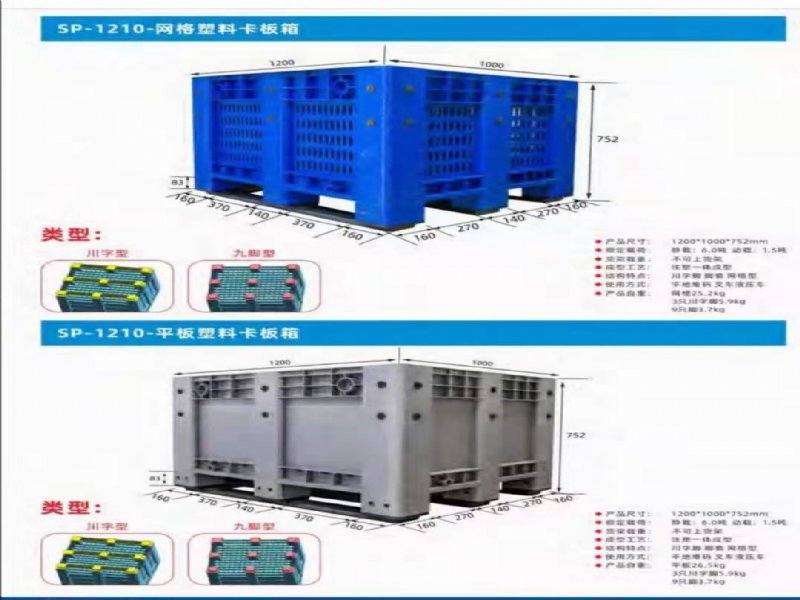 (1)塑料箱式托盘(pallet)又称:塑料卡板箱。塑料卡板箱是为了便于货物装卸、运输、保管和配送等而使用的由可以承载若干数量物品的负荷面和叉车插口构成的装卸用垫板。它是物流产业中*不起眼,却又无处不在的一种物流器具,是静态货物转变为动态货物的主要手段。尽管只有一米见方大小,却“可以移动整个地球”,所以又叫做“活动的地面”、“移动的货台”。