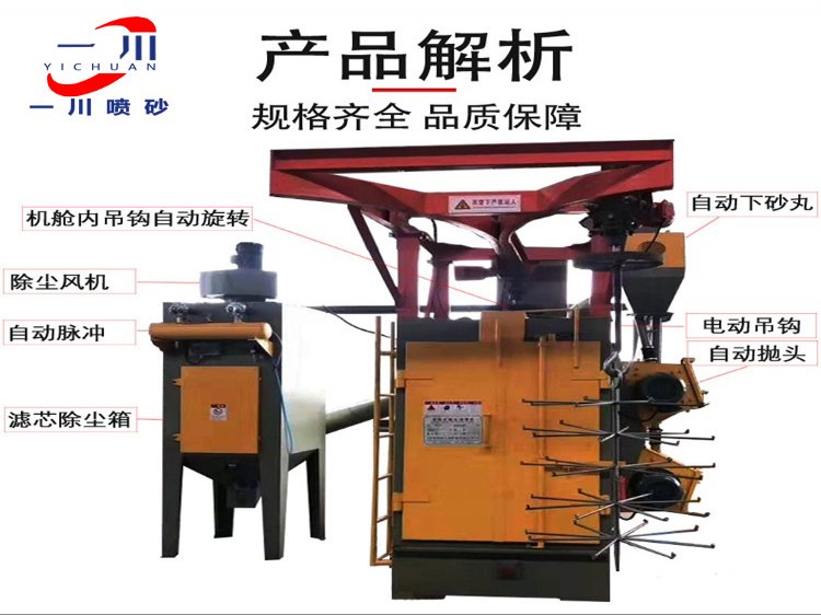 吊钩式抛丸清理机是以单个吊钩为工件的运载工具。每台设备一般设1-2个吊钩,每次一个钩件在清理室内清理,其余钩件在室外装、卸料,间歇作业。利用抛丸器将0.2~0.8的弹丸抛向工件的表面,使得工件的表面达到一定的粗糙度,让工件变得美观,或者改变工件的压应力提高寿命。并且本机型适合于不宜碰撞的细长、薄壁件的清理