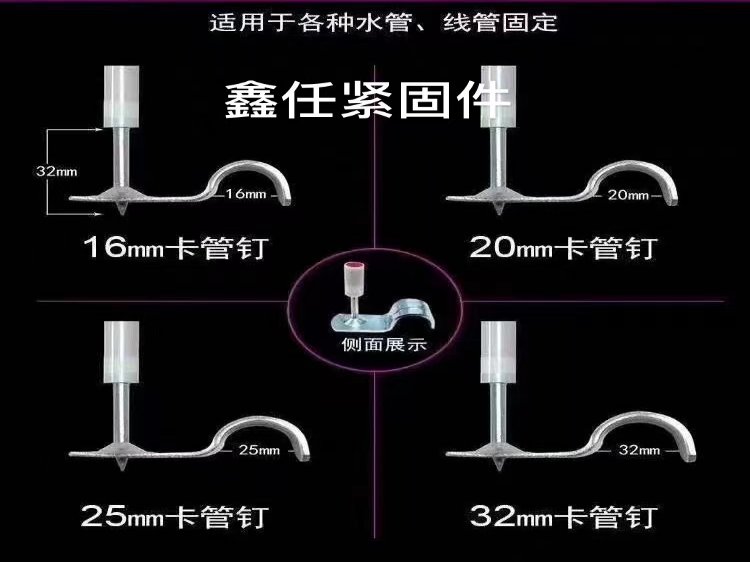 卡管一体钉:顾名思义固定水管线管用的。使用32mm一体钉,搭配的铰片有个半圆形的弧度。直径为16mm、20mm、25mm、32mm、40mm、50mm,这些尺寸分别对应水管的外径。