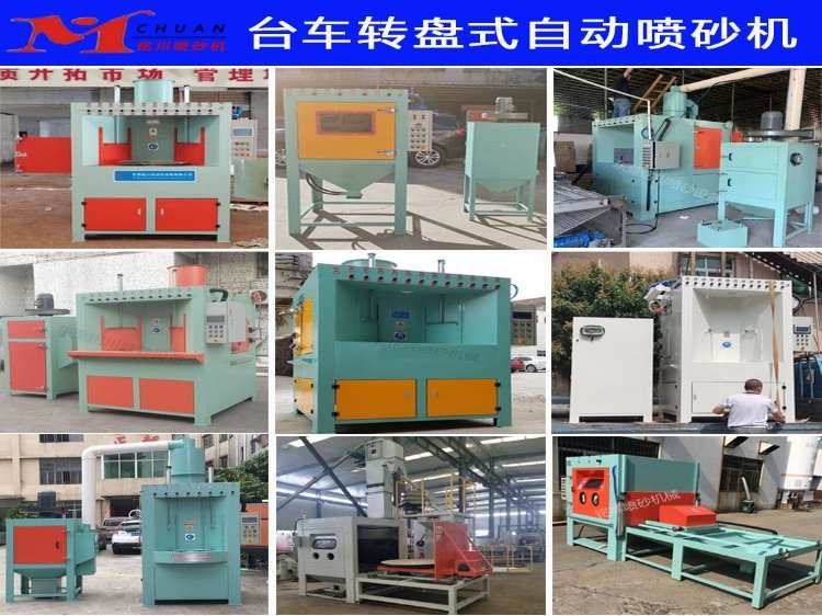 转盘式自动喷砂机有间歇转盘式自动喷砂机、连续转盘式自动喷砂机、自动台车转盘式喷砂机,固定转盘式自动喷砂机,转盘式自动喷砂机可采用大转盘间歇回转或连续回转,小转盘公转,多工位同时加工;采用吸入式喷砂,即利用压缩空气在喷枪内高速流动形成负压产生引射作用,将旋风分离器贮箱内的砂料通过输砂管吸入喷枪内,然后随压缩空气气流由喷嘴高速喷射到工件表面,达到喷砂加工目的。