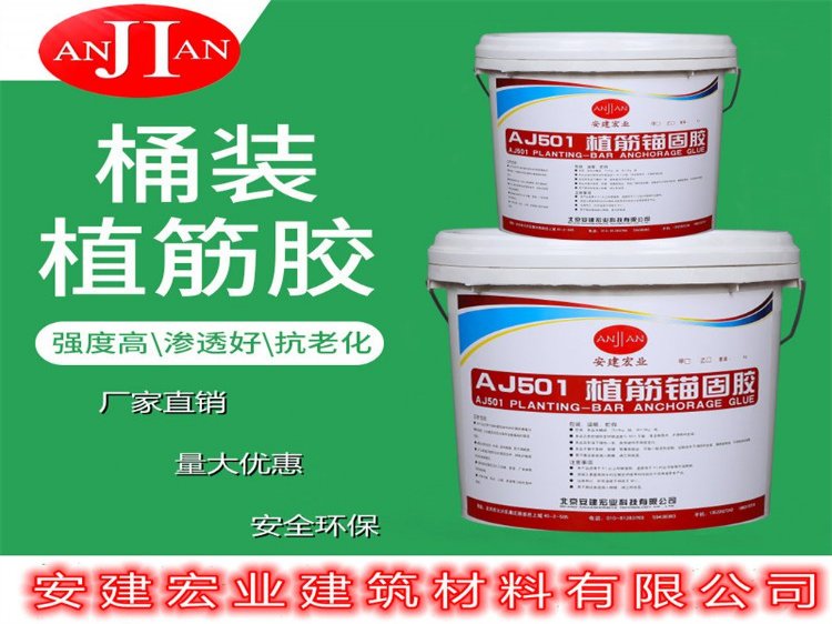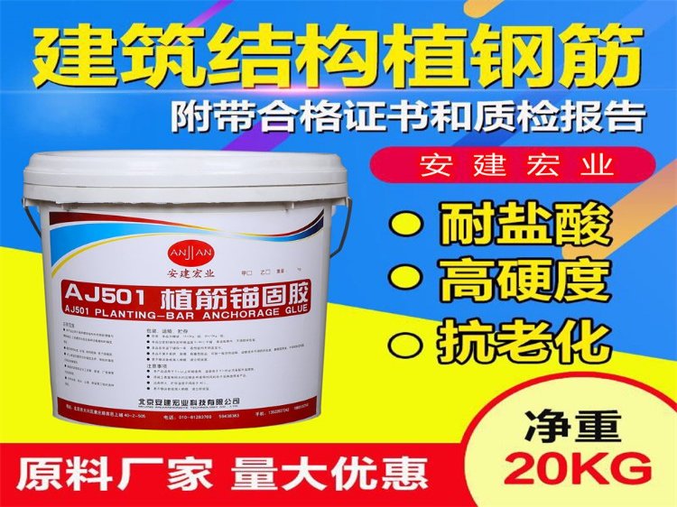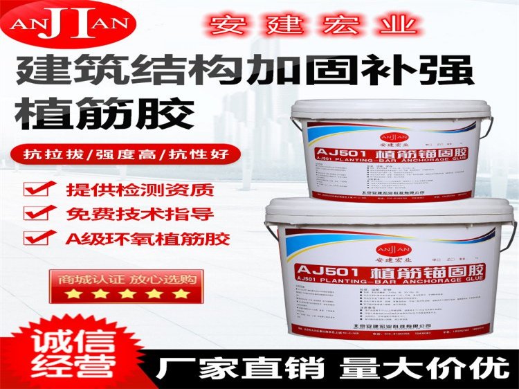 AJ-501环氧植筋锚固胶系A、B双组份改性环氧类结构胶,具有抗拉强度大,与各种基材(混凝土、砖、石材)相容性好等特点,耐老化,可广泛应用于结构改造加固,设备安装,幕墙锚固安装等钻孔锚固钢筋、螺栓