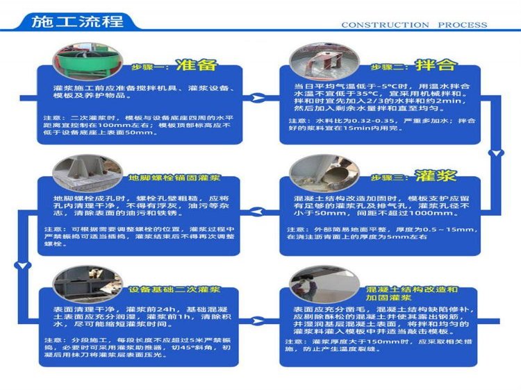2、机械、机电、大型机组类。电厂等机电设备安装,水泥厂水泥磨安装灌浆,球磨机设备安装、造纸设备安装、锻造设备安装、燃气设备安装、化工设备安装、煤矿设备安装灌浆,轨道及钢结构安装,机器底座、钢结构与地基怀口、设备基础的二次灌浆。