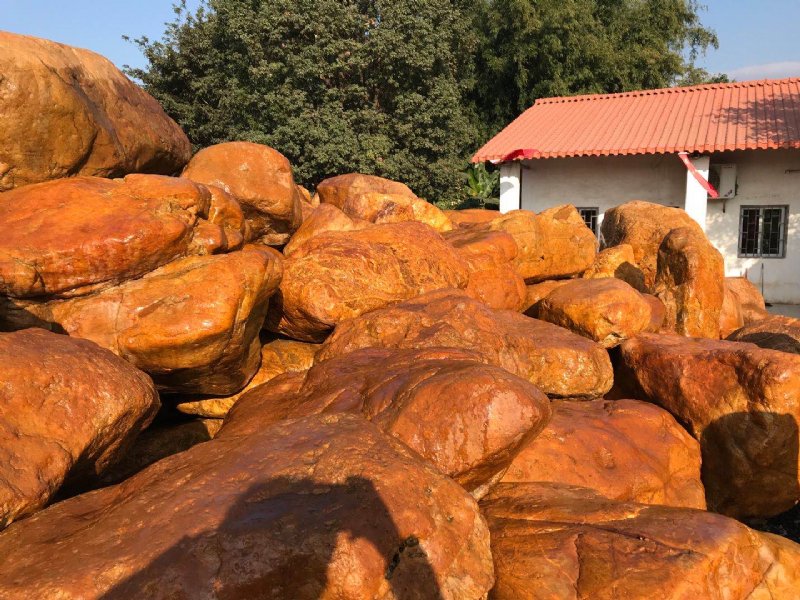 景观黄腊石石质上乘,形状佳美,而且价格实惠,被广泛应用于公司、工厂、厂房、学校、旅游景区、工业园、科技园、古建筑、房地产、酒店、别墅、家居、道路作为招牌刻字石、园林景观点缀石。黄蜡石色彩斑斓,多样,无一相同,这正是黄蜡石石材名贵的魅力所在。黄蜡石经长期天然,组织结构均匀,线胀系数极小,完全消失,不变形。可用作企业或是学校,景区或是房地产门面招牌,可大大提升企业形象!也可用于门牌石、雕刻石、刻字石等标志性的形象艺术设计制作。黄蜡石,因石表层内蜡状质感色感而得名。属矽化安山岩或砂岩, 黄蜡石主要成份为石英,硬度6.5~7.5,密度2.6(+0.1,-0.05)g/cm3,黄蜡石质感源于石英,而其颜色则来自氧化的铁质;黄蜡石石表滋润细腻,触感柔和,质地坚硬,色泽光彩耀人,形状怪异叠出,淳朴自然,有很高的欣赏价值,是陈设厅堂、点缀园林的上佳石种。