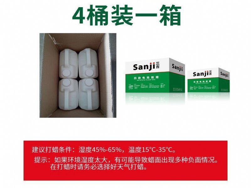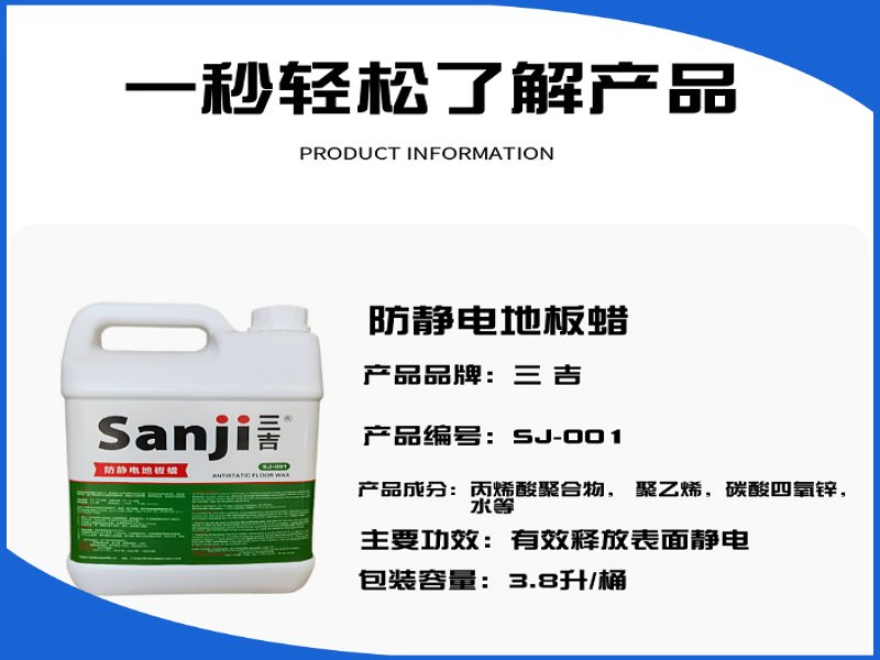 三吉牌PVC地胶防静电地板蜡抗静电蜡水采用先进导电聚合物技术,提供耐久有效的静电耗散功能,可有效消除静电积聚,释放表面静电,减少静电放电引起的功能失效、报废及尘埃积聚,并保持洁净、亮丽的外观效果。