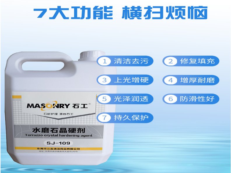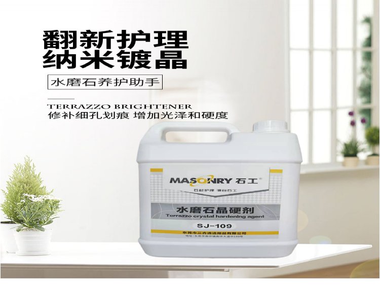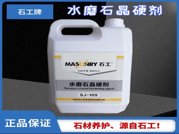 本品石工牌SJ-109水磨石镜面光亮剂晶硬剂石材养护翻新抛光液晶面剂根据水磨石的结构特点研发,具有极高的渗透性和扩散力,能渗入到水磨石基料的分子间隙。经打磨产生化学反应,生成二氧化硅晶体,迅速在水磨石表面形成坚硬光亮的结晶层,使水磨石本身硬度和密度大大增加,其表面产生高光泽度,并增加其防水、防污、防滑效果,令石材保持天然色泽,延长使用寿命。