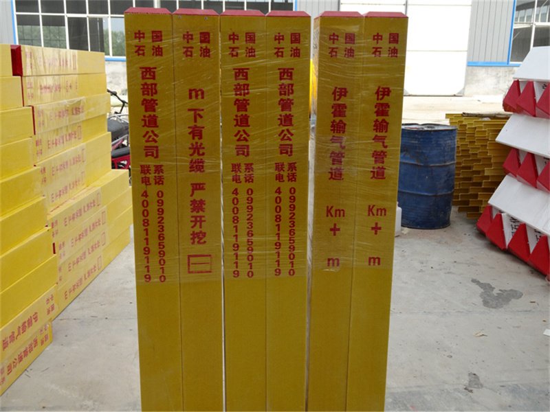 本公司生产的电力电缆用地埋玻璃钢标志桩(也称示警桩/警示桩)是FRP拉挤型材,其采用玻璃纤维及其制品作为增强材料,钙粉为填充剂,以合成树脂作基体材料通过玻璃钢拉挤机一次性拉挤成型。