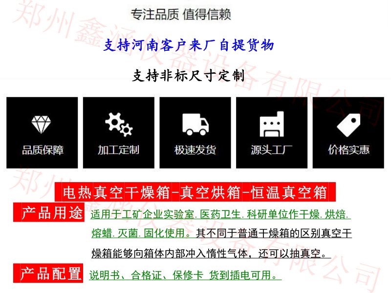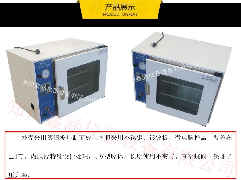 1、鑫涵仪器DZF系列智能型电热真空干燥箱 真空烘箱 外壳采用溥钢板焊制而成,内胆采用不锈钢、镀锌板,微电脑控温,温差在±1℃。内胆经特殊设计处理,(方型腔体)长期使用不变形。真空蝶阀,保证了压升率。