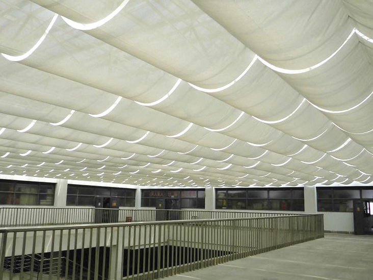 天棚帘系统是种专为大面积采光顶而设置的织物遮阳装置。该电动遮阳系统在电子盒的控制下实现电机的正转和反转来收放面料以达到遮阳的目的。
