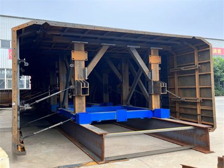 涵洞台车钢模板具有如下优点:通过调节外模面板与内模面板的间距,便于制造涵洞墙身,涵洞台车能行走到下一段涵洞墙身的位置进行接续制造;外模面板与内模面板的调节稳定,能制造不同规格的涵洞;整体结构老固,制造好,使用便捷。 - 河南伟志模板有限公司