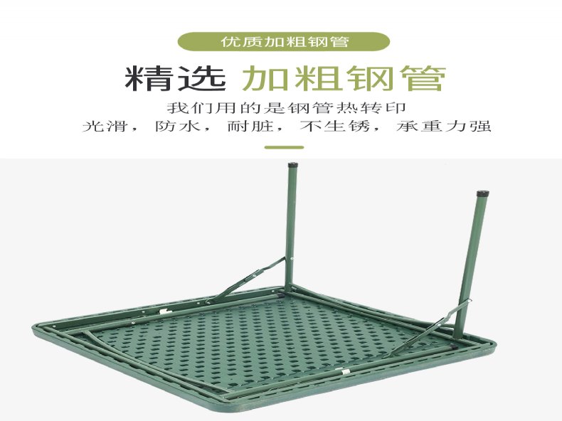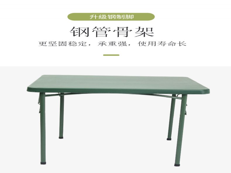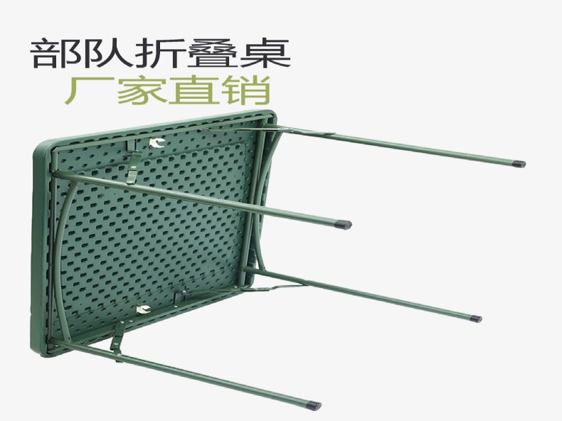 品名:全折叠户外野战钢制会议桌 材质:优质钢管方管骨架,钢材表面经油除,静电喷涂烤漆工艺制作, 展开后:..