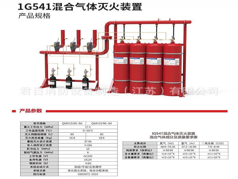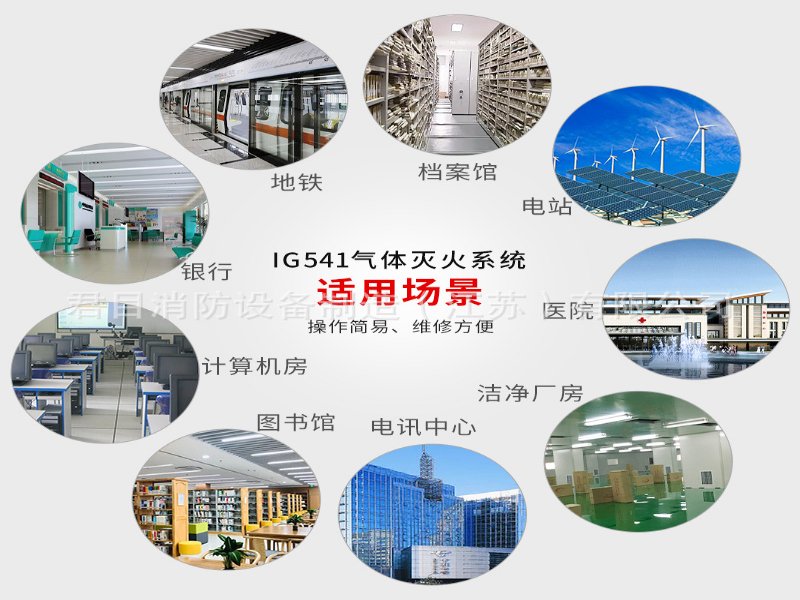 IG541混合气体灭火系统可用于扑救下列类型火灾:A类-可燃固体表面火灾,例如木材和纤维类材料的表面火灾;B类-可燃液体火灾,例如庚烷、汽油燃烧引起的火灾;C类-灭火前可切断气源的气体火灾;E类-电器设备火灾。不适用于扑救D类活泼金属火灾,也不适用于扑救含有氧化物的化合物。 - 君目消防设备制造(江苏)有限公司